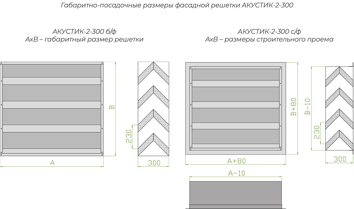 АКУСТИК - шумопоглощающая наружная решетка, предупреждающая проникание шума из окружающей среды в здание через приточные или вытяжные отверстия и наоборот. Решетка Акустик 2-300 имеет двусторонние жалюзи глубиной 300 мм.