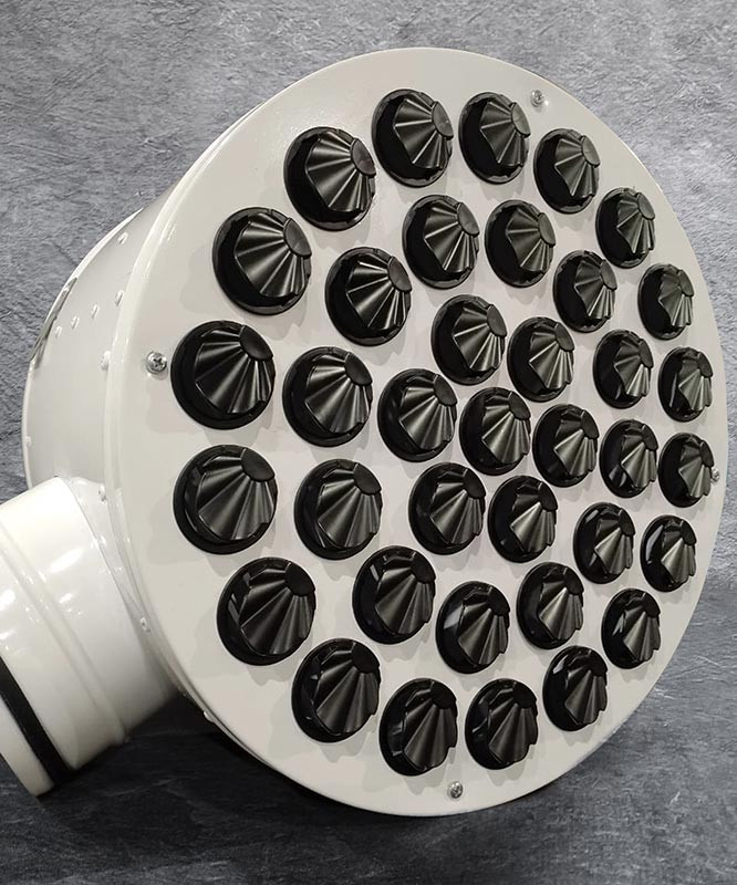 Конструкция воздухораспределителя представляет собой камеру статического давления (КСД) с воздухораздающей панелью круглой формы, в которой установлены поворотные ячейки в виде ракушек. Возможно изготовление воздухораспределителя прямоугольной формы - ВПТ.
