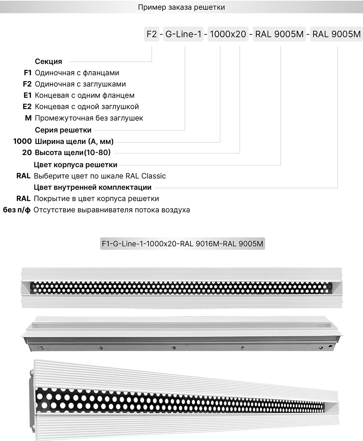 Отличительной особенностью конструкции щелевых решеток G-Line-1 от других решеток скрытого монтажа является отсутствие направляющих устройств для регулирования потока воздуха. Внутрь решетки установлена перфорированная пластина черного цвета для равномерного истечения потока воздуха в помещение.