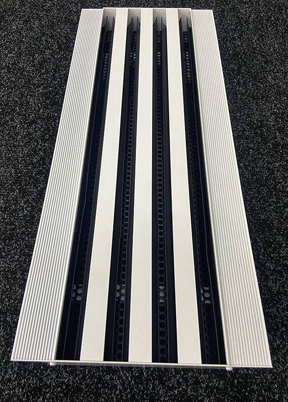 Конструкция профиля решетки предусматривает фланец с углублениями и отверстиями для лучшей адгезии финишного материала по длине решетки и заглушки с торца. После монтажа решетки, видимой частью в помещении остаются только щели.